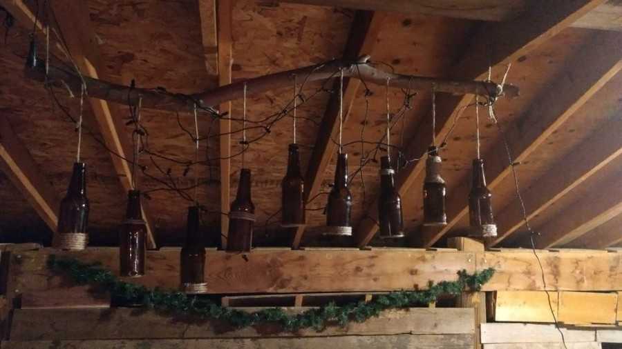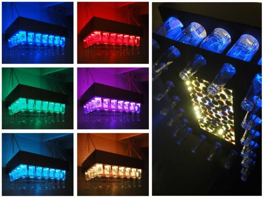 В некоторых кафе, пабах применяют для декора зала оригинальные светильники из бутылок. Это могут быть пивные бутылки. Они могут служить как плафоном для лампочек, так и быть интересным обрамлением для лампы.