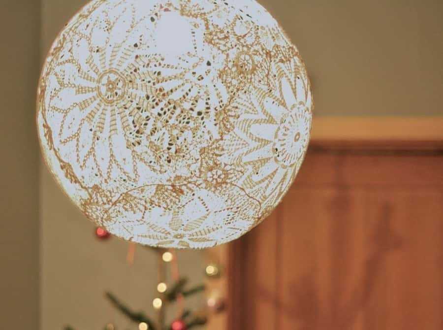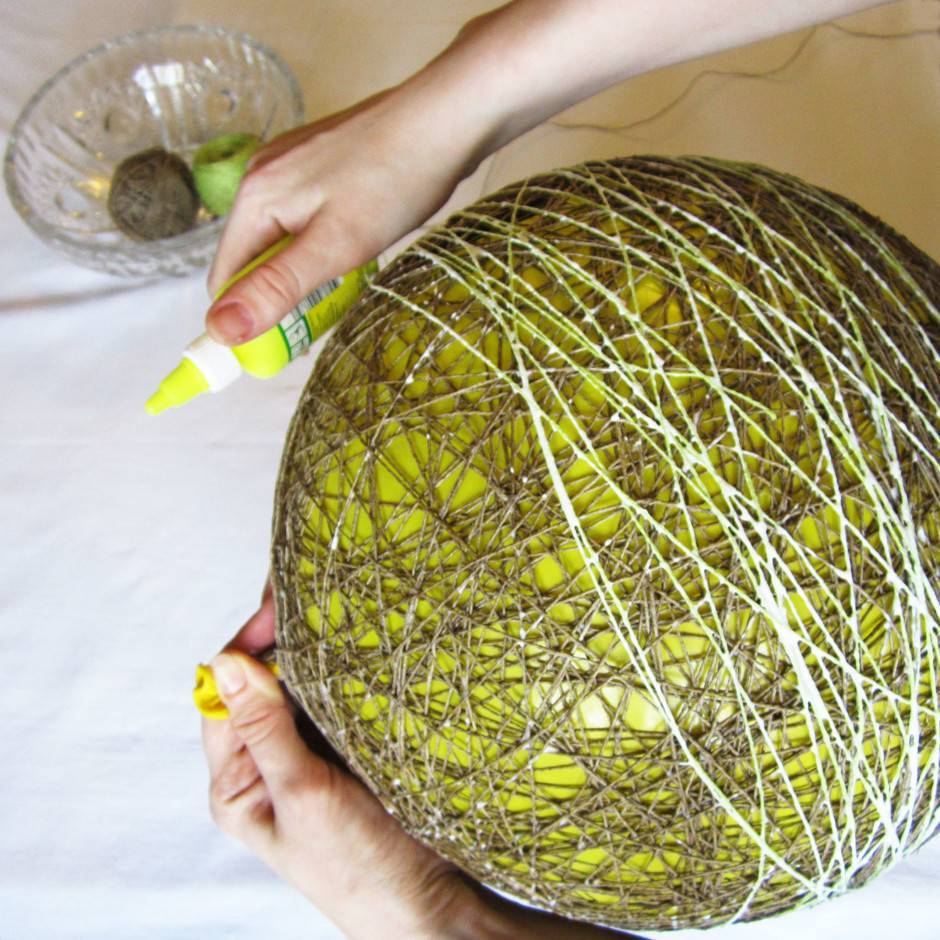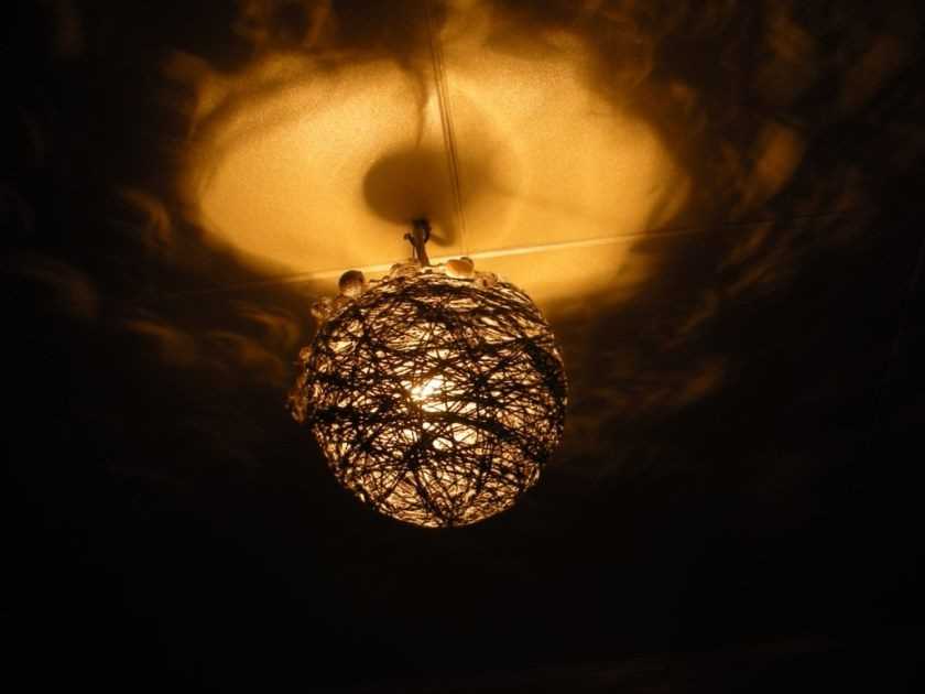 Что нужно сделать, чтобы декор светильника был максимально успешным: во-первых, сначала стоит «набить руку» и сделать пару небольших светильников для пробы. Во-вторых, до наматывания ниток на шарике нужно отметить место, где не должно быть ниток. Через это отверстие будет извлекаться шарик, и вставляться лампочка.