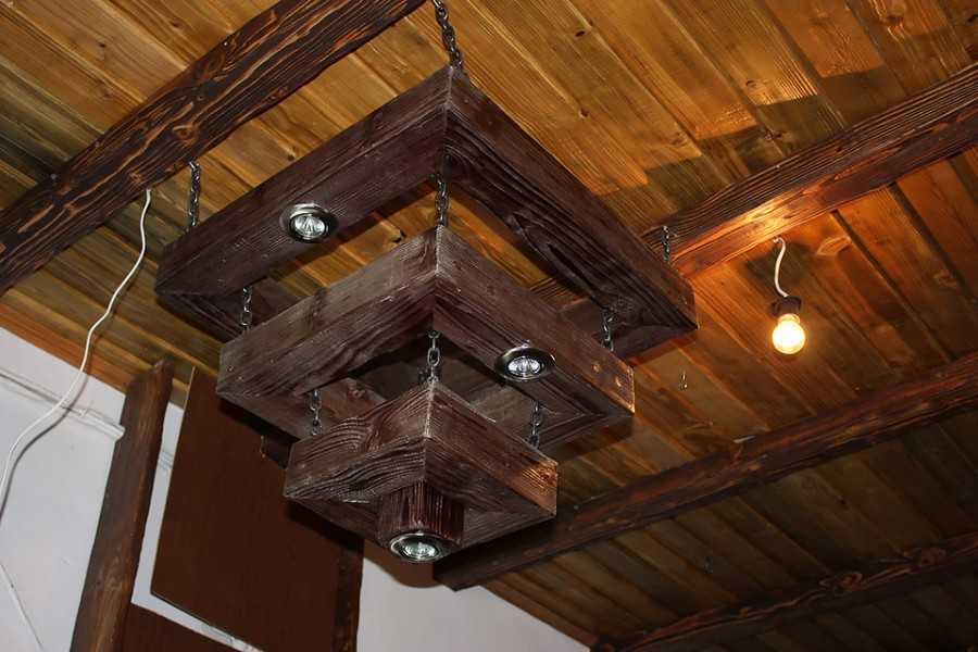 Люстра из коряги – яркий и стильный предмет для гостиной Из бус можно быстро и легко сделать красивую люстру Деревянный материал, используемый для изготовления светильников, необходимо покрывать лаком Украсить кухню или загородный дом можно светильником из бутылок Из пласиковых ложек делают красивые светильники в форме ананаса, шара или и т. д Светильник из металлических тёрок – стильный и функциональный декор для кухни Остатки водопровдных труб и соединмтельные крепежи – необычный материал для потолочного светильника