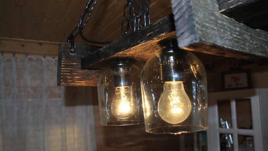 На даче мы сделали светильник из двух банок объёмом 0.75 л и двух кусков доски с неровно срезанными краями. Доски соединены между собой под прямым углом, а вся конструкция установлена на стене дома под крыльцом. В банки-плафоны вкручены патроны, в которые вставлены светодиодные лампы. Светильник такого стиля идеально подходит для загородного дома или интерьера в деревенском стиле.