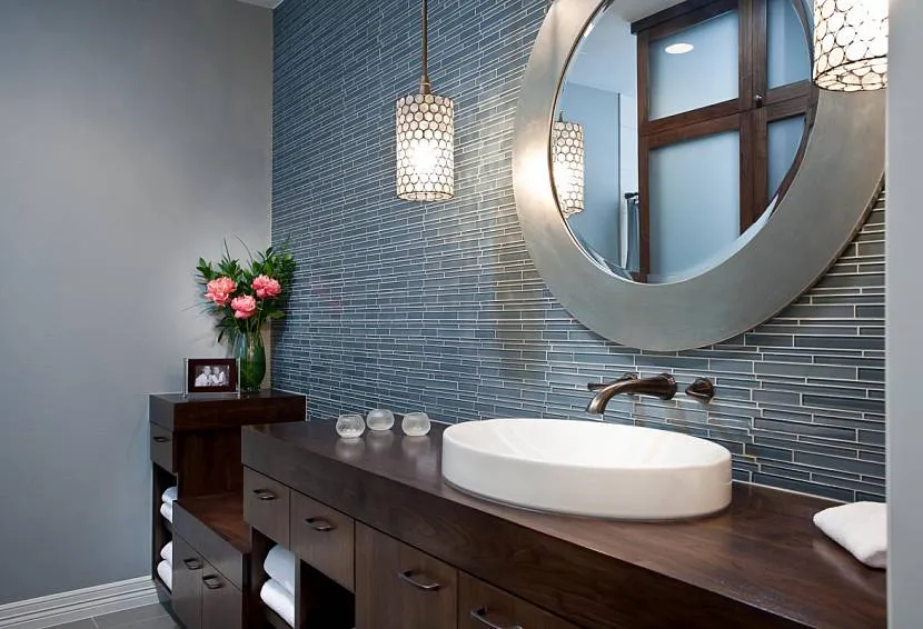 Интересная форма светильников возле зеркала в ванной комнатеИсточник stroy-podskazka.ru