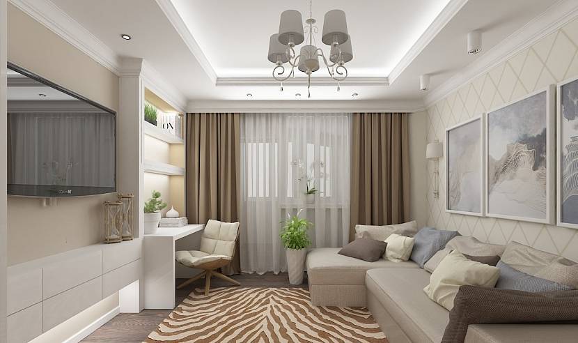 Светлый интерьер гостиной лучше будет смотреться с оттенками карамели, кофе с молоком, сильно разбавленного какао, крем-брюле