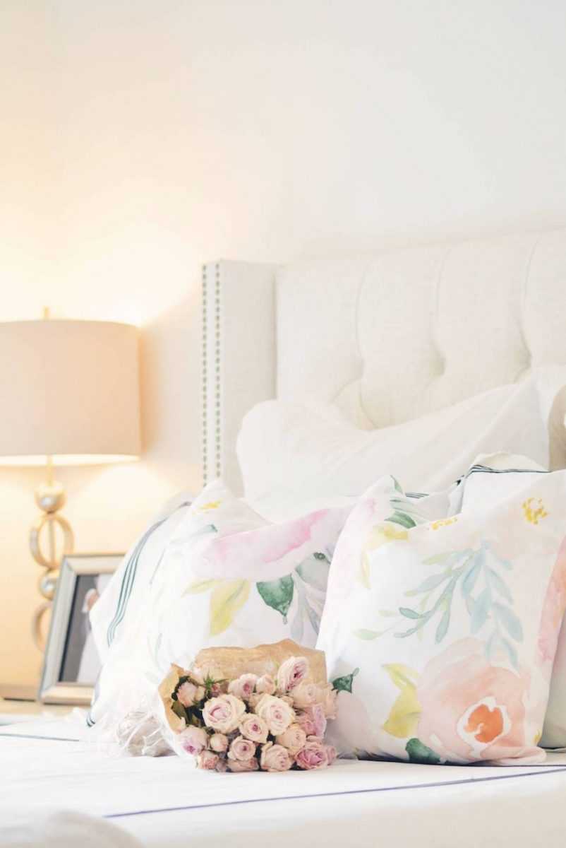 По фото уютной спальни видно, что особая обстановка формируется в результате использования живых растений. Это могут быть горшки с цветами или срезанные букеты. При этом растения используют в минимальном количестве. При выборе букета ориентируются на стилистику, цветовую гамму помещения. Желательно исключить сильно пахнущие экземпляры.