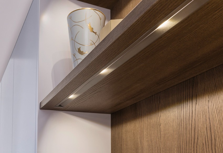 Врезные светильники, линейные и точечные. Будучи весьма тонкими, монтируются в нижнюю полку шкафчика заподлицо с нижней поверхностью.