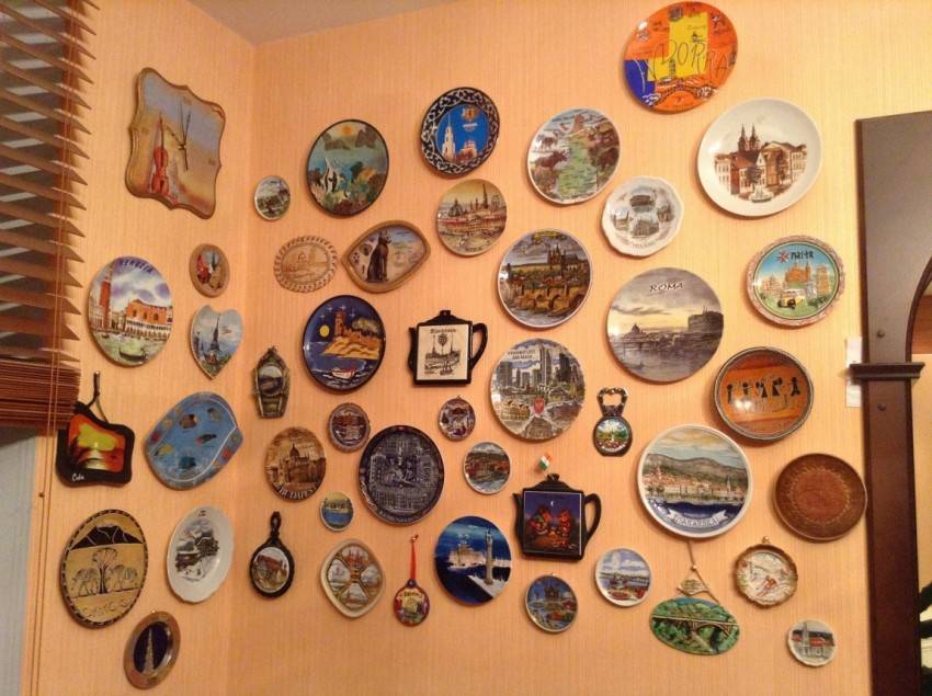 Памятные тарелки на стену с изображением исторических мест привозят из путешествий как сувенир. Повесив несколько штук в одном месте, получают уникальную композицию, которая будет интересна гостям. Фотосалоны предлагают печать фотографий на декоративных тарелках. Выбор экспозиций неограничен. Если нанести поздравительную надпись — получится хороший подарок другу. Популярны также этнические, цветочные мотивы, гжель, текстиль, китайский фарфор, абстрактные фигуры. Не выходят из моды медные подносы.