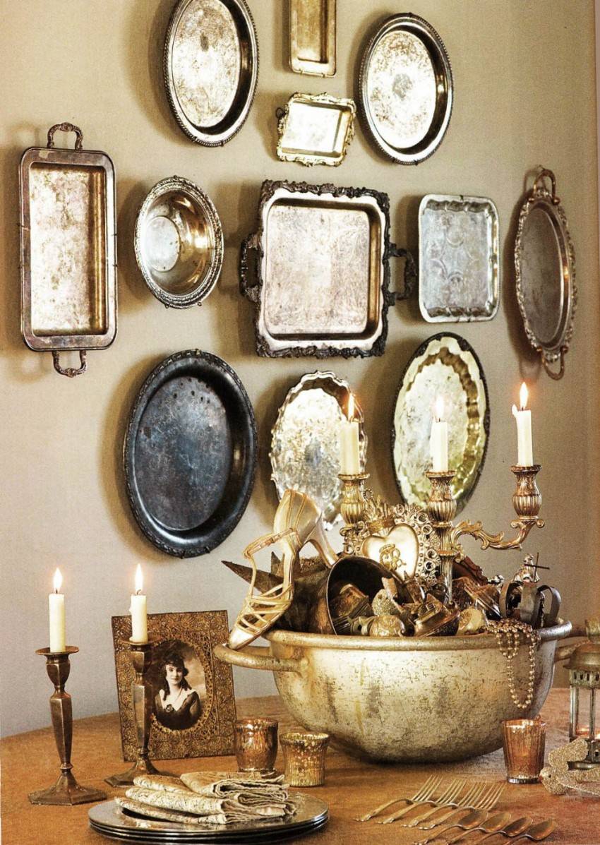В этнических стилях оказываются уместны медные подносы, тарелки с народной росписью и текстильные как на фото ниже;