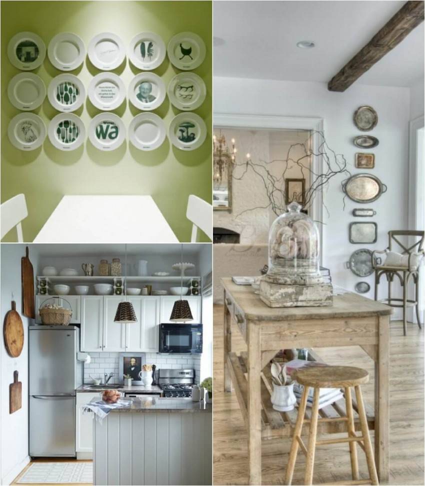 Интерьер кухни в современном стиле станет интереснее благодаря сочетанию самых разных ярких и пестрых тарелок, объединенных формой, цветом или рисунками;
