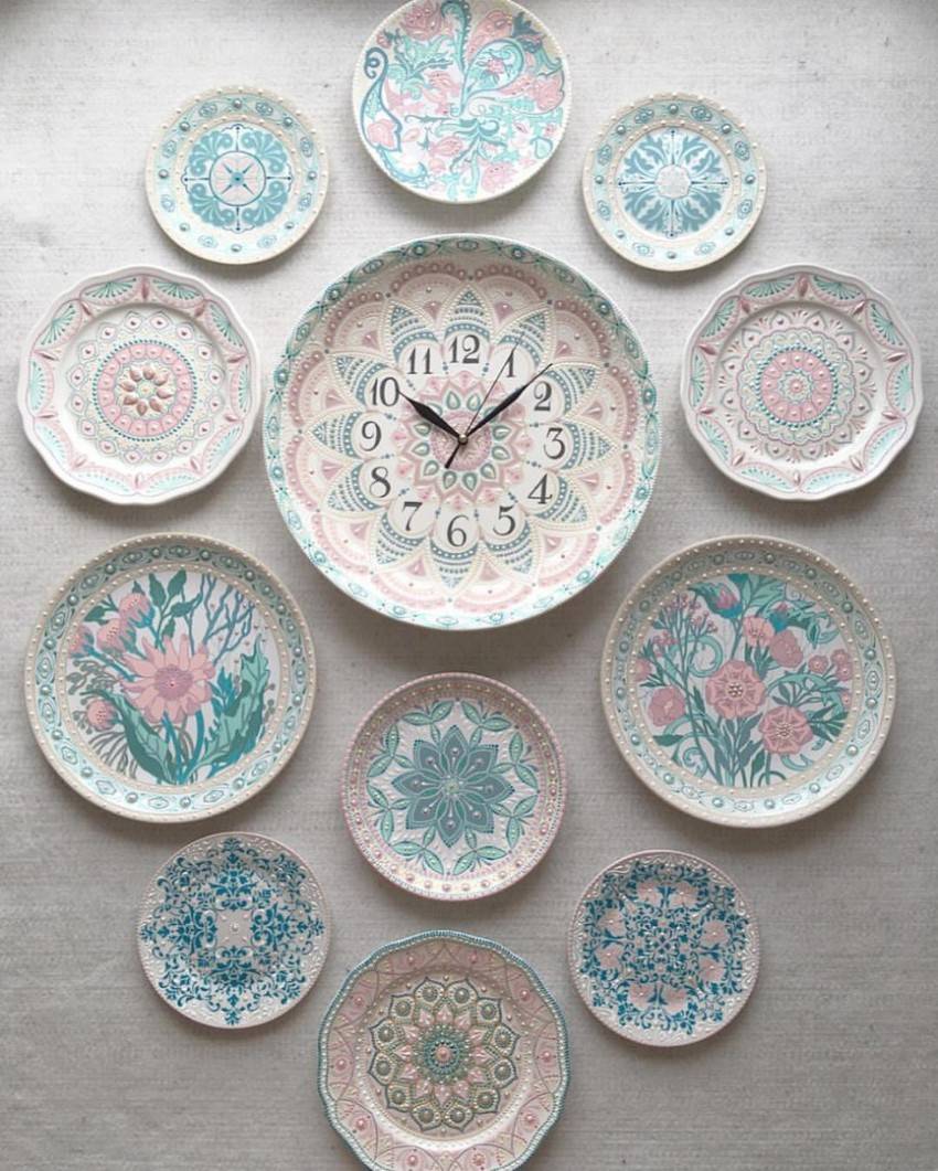 Составляя коллаж из посуды, вы можете составить комбинацию из разноразмерных блюдец с рисунками разной тематики, но в одной цветовой гамме. При этом тарелки могут быть как однотонными, так и с каймой, росписью, принтом.