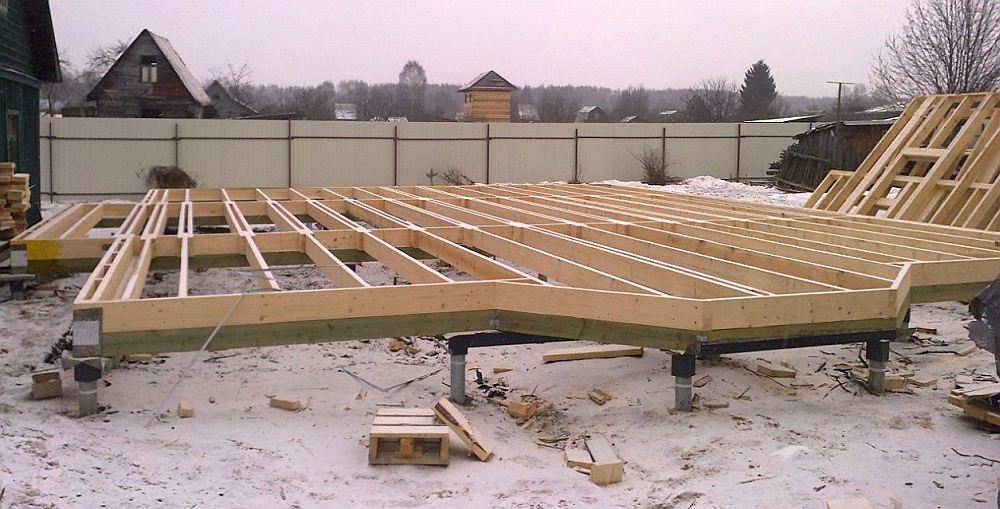 - с помощью дополнительных брусьев, уложенных между лагами пола, на которые затем опирают вертикальные стойки, составляющие основу внутренних стен.