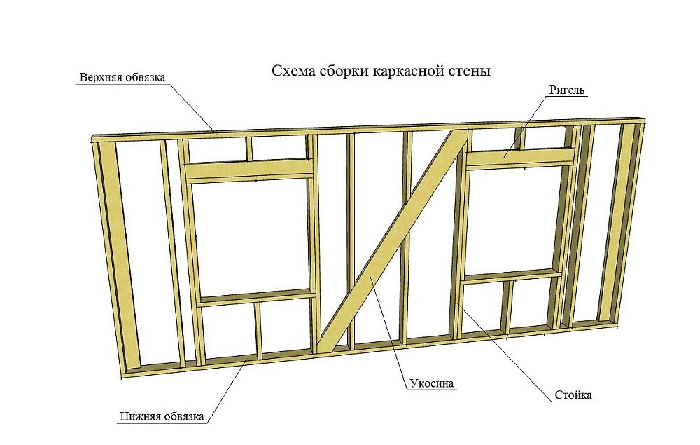 Укосины – это доски с сечением 25х100 мм. Зафиксированные на брусьях нижней, верхней обвязки и стойках, они придают конструкции пространственную жесткость.