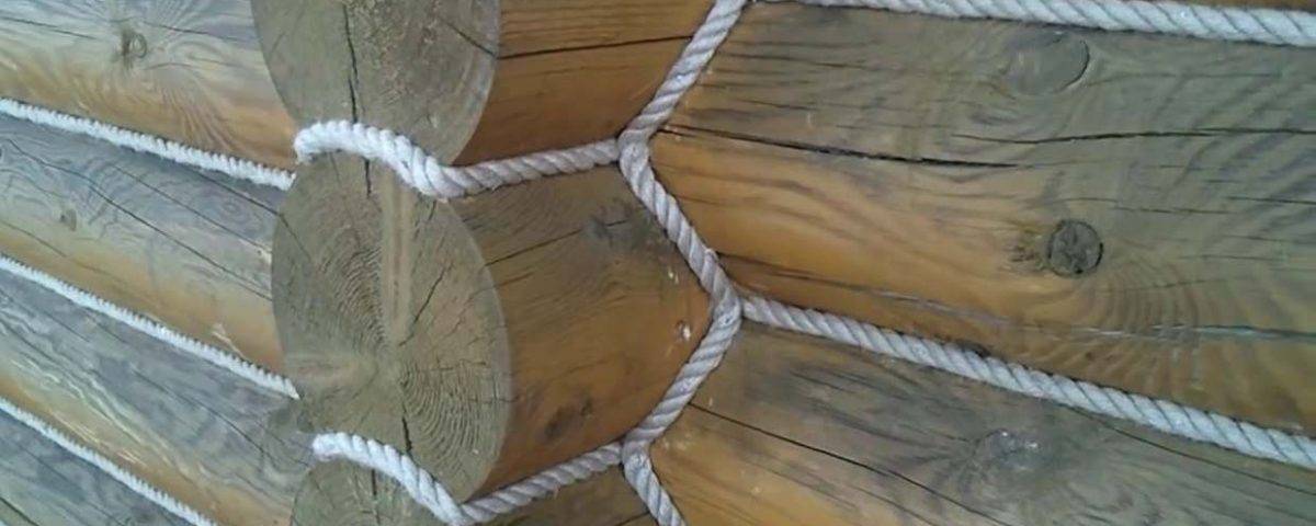 Далее в швы между бревнами закладывают специальный полиэтиленовый шнур. Он предназначен для заполнения межвенцового пространства, поскольку полностью заделывать герметиком всю щель дорого и неэффективно. Слишком крупные стыки сначала законопачивают паклей, джутом, затем металлическими скобами прикрепляют шнур из вспененного полиэтилена. Обе поверхности стыков оклеивают малярным скотчем, чтобы слой герметика получится ровным.