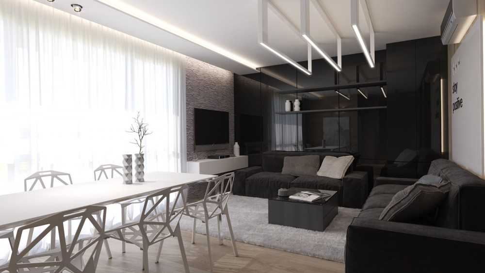 Однако не стоит забывать о недостатках, которые проявляются, когда комната перегружены чернотой даже при сильной освещенности: подавляющая атмосфера, визуальное уменьшение пространства, вызывание чувства страха и отчужденности, мрачность, официальность и скудность.