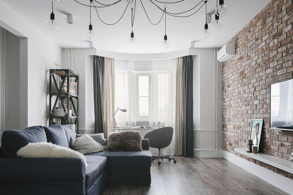 Если вы выбрали очень минималистичную отделку гостиной, можно добавить оригинальности и неповторимой атмосферы обстановке с мебелью. Самым главным оборудованием в гостиной является диван. Поэтому важно, чтобы он был комфортным. Вы можете уверенно ввести в обустройство гостиной мягкий большой диван. Он будет отлично смотреться на контрастном строгом фоне. К такому дивану можно добавить журнальный столик в типично индустриальных тонах, чтобы правильно сбалансировать интерьер комнаты. Минималистичный стол из натурального дерева или необработанного металла отлично подойдет к уютному дивану