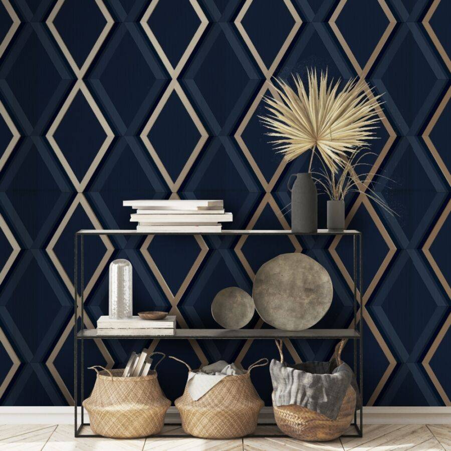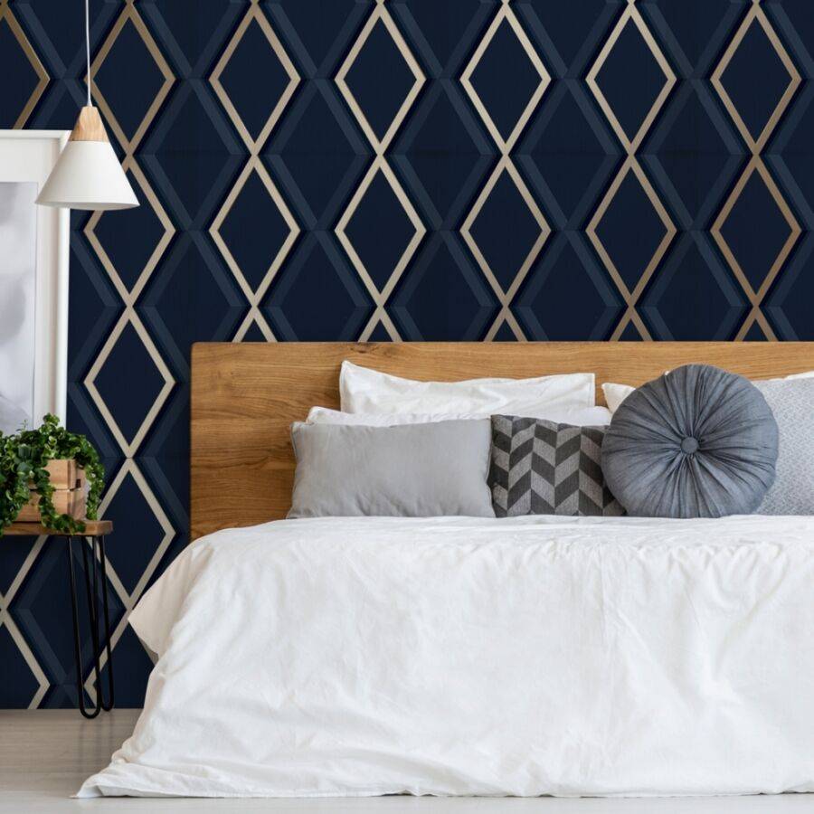 Интересным решением интерьерные дизайнеры считают темно-синие обои в интерьере, дополненные золотыми аксессуарами и светлым текстилем.