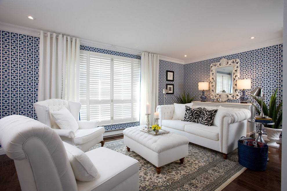 С синими обоями будет гармонично сочетаться мебель в белых тонах, она осветлит интерьер. Форма мебели поддержит стилистическое направление. Простые формы подойдут для морского, современного, лофт и хай-тек стиля. Для классического интерьера подойдет мебель с изящными и плавными формами, цветовое решение может быть в пользу белого, коричневого или бежевого тона.
