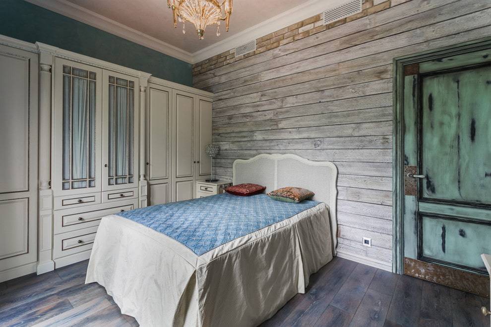 На фото спальня с серо-зеленой дверью, декорированной патиной.