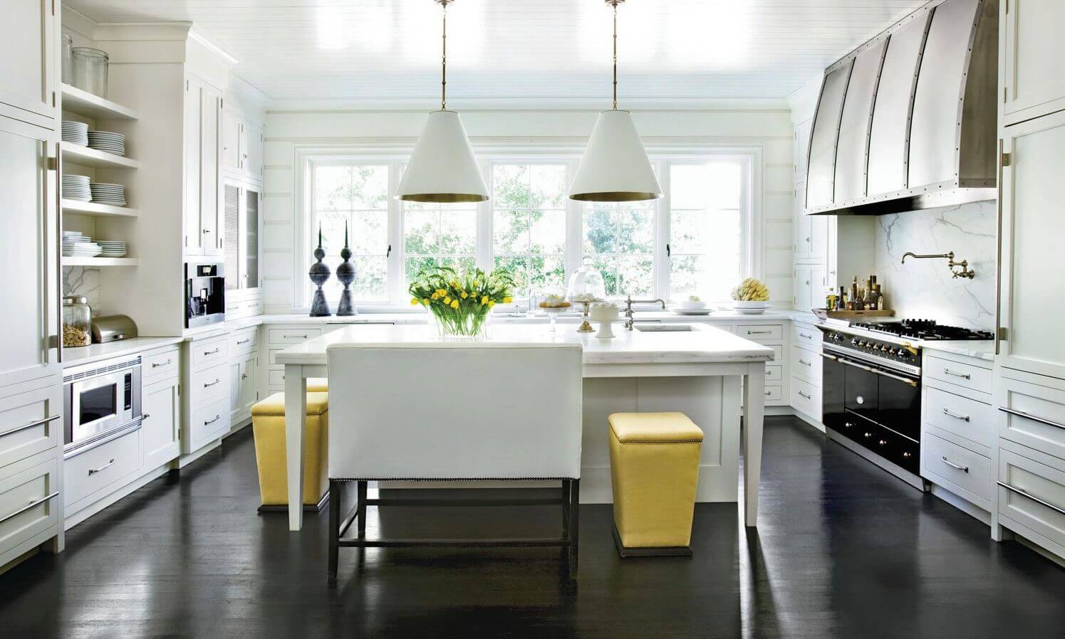 Наиболее популярный вариант в сочетании с темными полами, особенно в небольшом помещении, — белая мебель со светлой столешницей. Всё чаще можно встретить сочетание черных полов и белого гарнитура на кухне.
