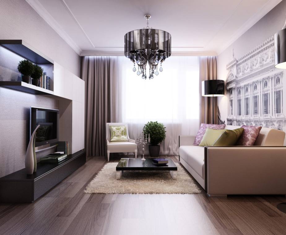 - Классический. Светло-бежевые, мягкие, огромные диваны и пуфы за стеклянным журнальным столиком. Над ним — хрустальная люстра. Аксессуары в виде фиолетовых штор, фиолетовых подушек и ковра с бежевым и фиолетовым рисунком;