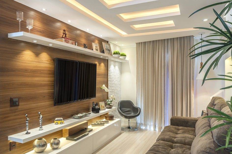 Чтобы коричневая комната не выглядела мрачной, нужно многоуровневое освещение (сценарии). Осветительные приборы организовывают для каждой зоны, не забывая об основном потолочном светильнике. Поворотные споты позволяют концентрировать электричество в определенных участках. Шкафы, полки и ниши подсвечивают диодной лентой.