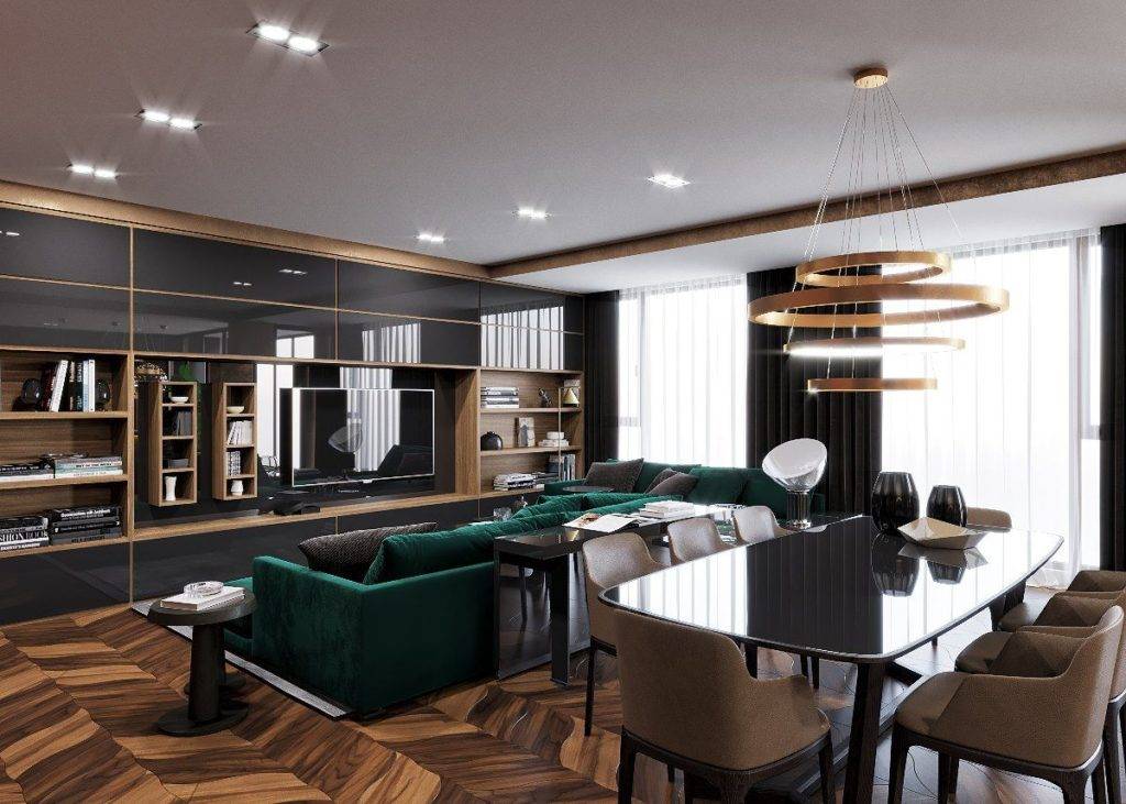 В функциональном помещении однотонные стены дополняют контрастными или сдержанными акцентами в других тонах. И мебель при этом будет либо в общей палитре, или же в более насыщенной гамме цвета-компаньона – шоколадного, темно-серого, изумрудного оттенка.