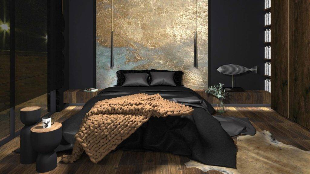 Однако, если спальня большая и просторная, темная мебель также может сочетаться с более насыщенными или даже ближе к черным цветам пола и стен