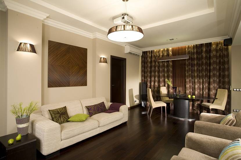 Это зона для приема гостей и проведений семейных торжеств, а значит обстановка должна быть уютной и в то же время нарядной. В этом случае лучше всего подходит более светлая отделка вертикальных поверхностей. Если в гостиной постелен ламинат или паркет венге, вишни или мореного дуба, стоит подбирать мебель белого, молочного, песочного оттенка, либо использовать более яркие детали, используя зеленый, синий, голубой, золотистый и пр.