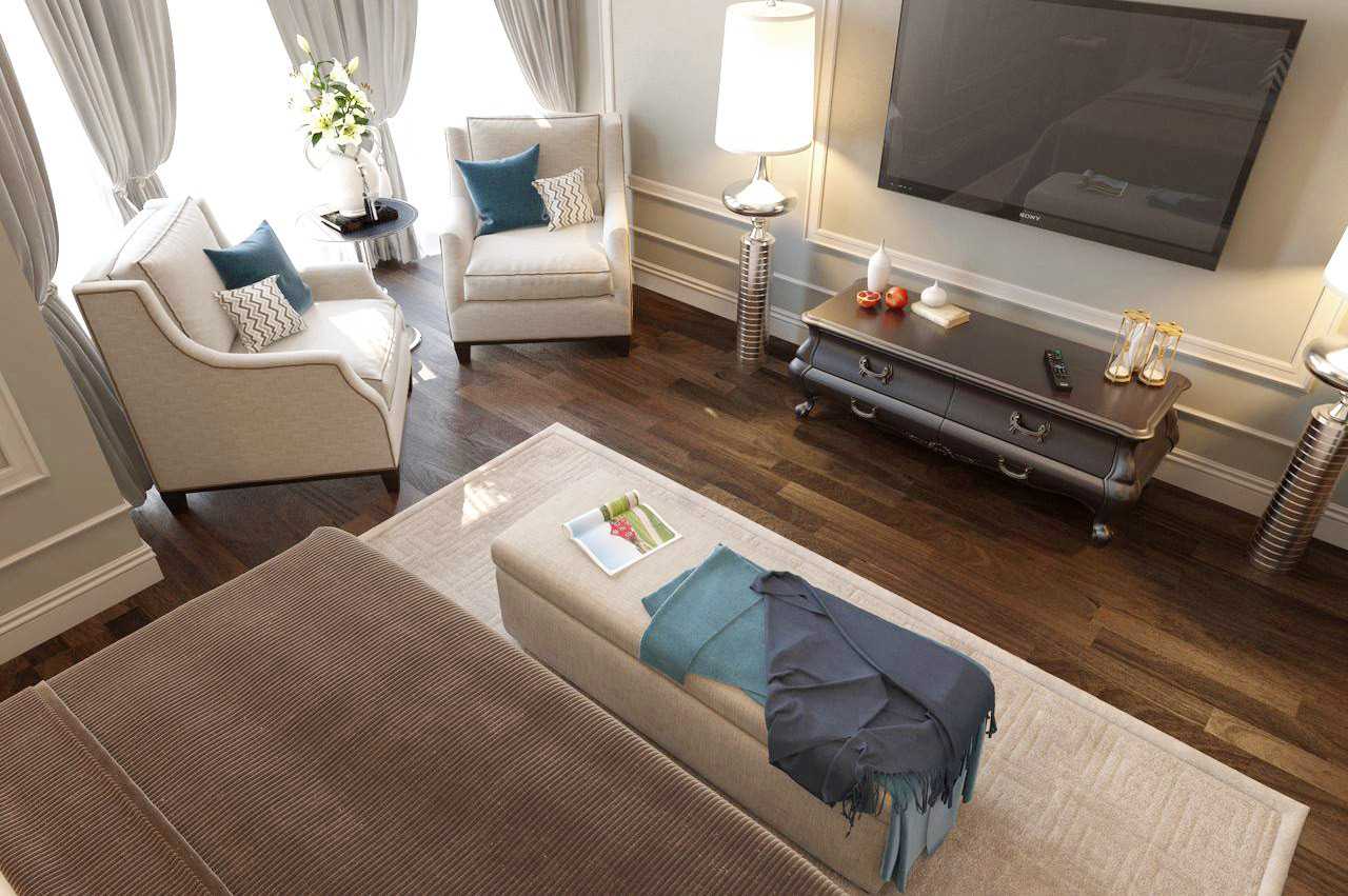 Напольное покрытие темного цвета подходит для спальни, учитывая, что его практически не видно под мебелью: кроватью, купе, комодом, тумбой, туалетным столиком и, возможно, мягким уголком для чтения. Как и в гостиной, здесь лучше выбирать молочный или бежевый мебельный комплект. Гарнитур же в тон полу на белоснежном, песочном или золотистом фоне уместен в готическом стиле, ренессансе или в стилизации под охотничий домик. Подобное оформление уместно лишь для просторных спален.