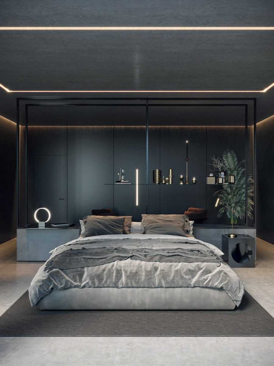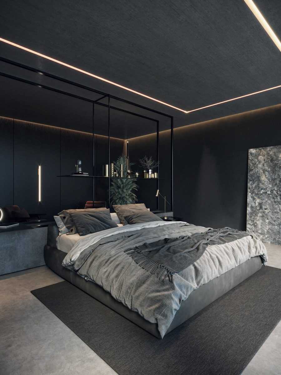 Интерьер темной спальни в стиле хай-тек сохраняет свободное пространствоИсточник design-homes.ru