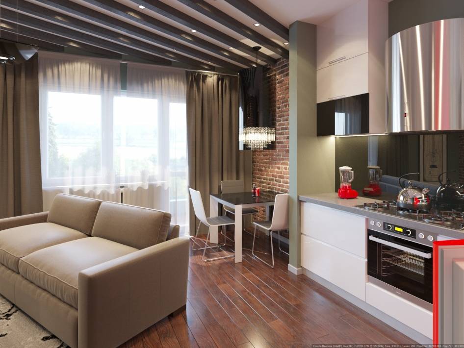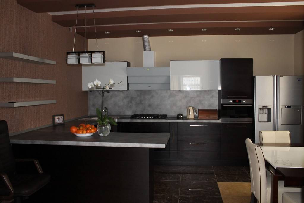 Если вы хотите придать более брутальный вид своему помещению, то дизайн кухни-гостиной с темными полами рекомендуется стилизовать выкладкой кирпича на стене. Темный ламинат на полу отлично будет смотреться и в стиле хай-тек, если дополнить его гарнитуром, фасад которого выполнен в цвете венге.