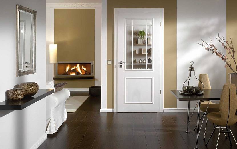 Для визуального увеличения пространства квартиры и большего освещения подойдут двери со стеклом, которое может быть прозрачным, матовым или темным, в зависимости от комнаты.