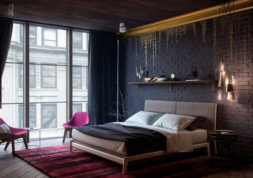 Темная спальня в стиле лофт – характерная кирпичная стена, свисающие лампыИсточник design-bathroom.ru
