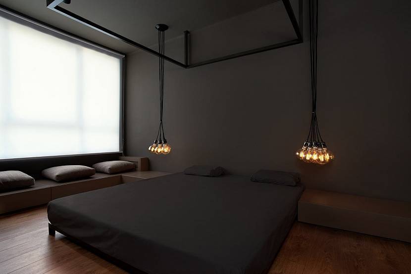 Спальня в стиле минимализм с темным ламинатомИсточник pol-master.com