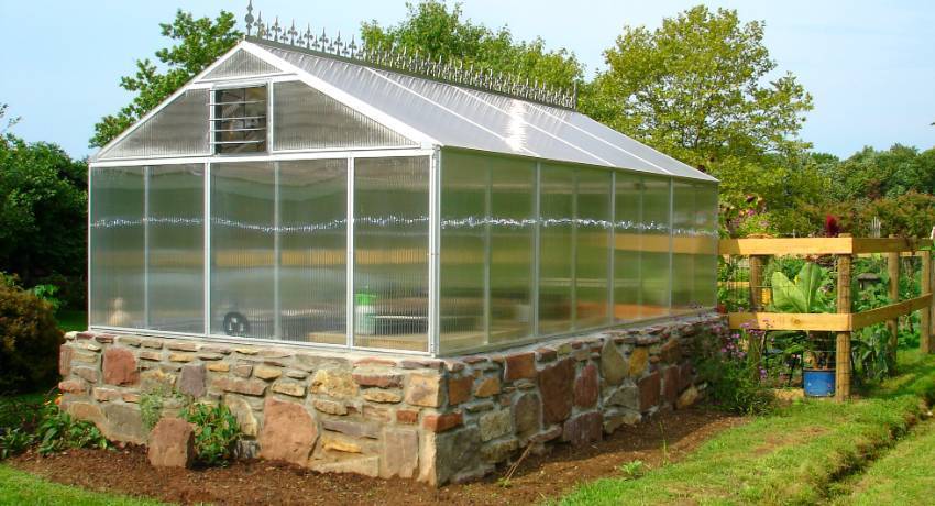Для внушительных конструкций лучше использовать каменный фундамент, который способен выдержать вес парника
