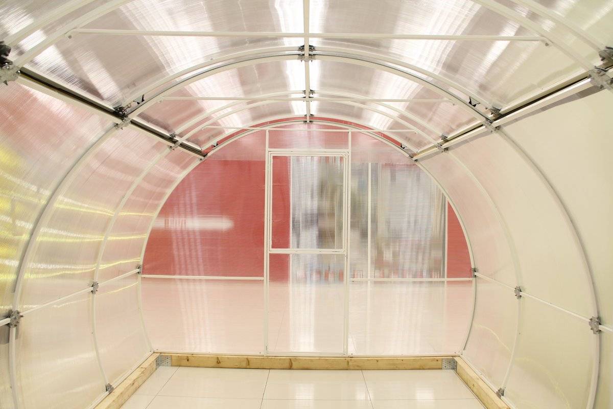 Каркас изделия выполнен из стальных трубок и полимерных компонентов. Ввиду отсутствия внешней нагрузки в зимний период усиление дуг в таких теплицах не практикуется. Благодаря облегчённой конструкции сооружение характеризуется небольшим весом и простотой монтажа. Толщина сотового поликарбонатного покрытия составляет 1,2–1,5 мм, сечение металлопрофиля – 2х2 см. Расстояние между соседними арочными дугами не превышает одного метра, что в сочетании с высокопрочным ячеистым покрытием позволяет сооружению легко переносить высокие ветровые нагрузки.