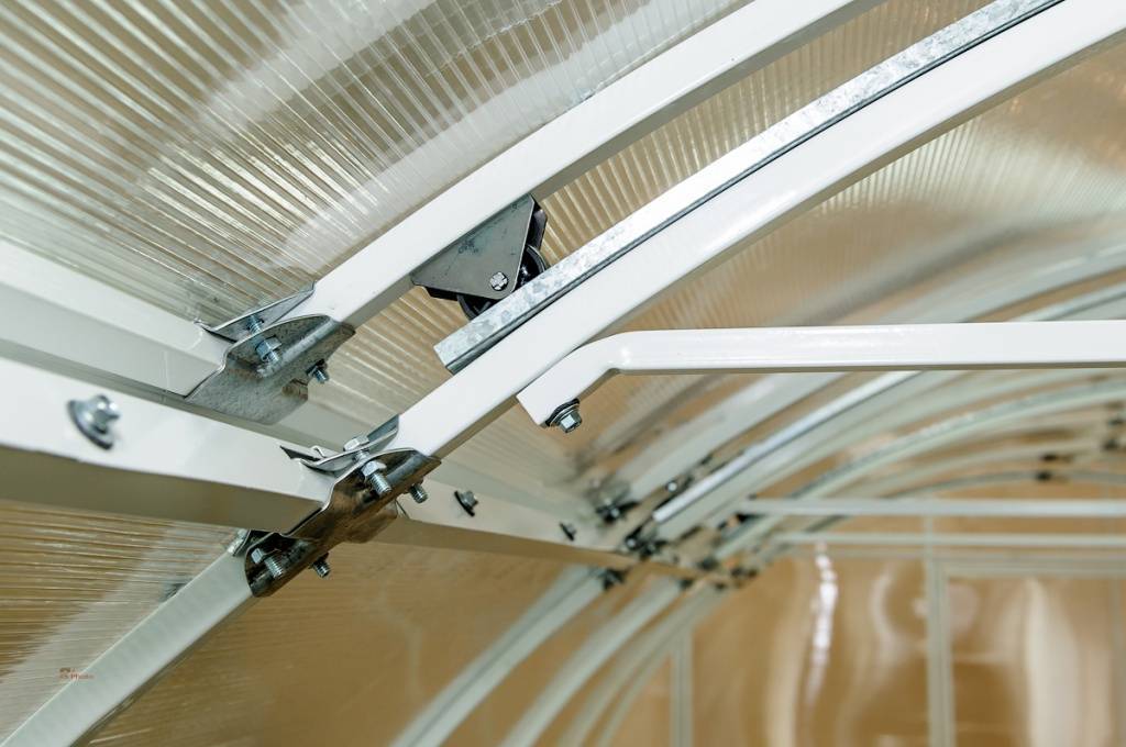 - Под крышей, поперек основных балок, монтируют шпалеры, который выполняют не только функцию усилителей конструкции, но и могут использоваться в качестве планок для подвязки растений. Далее с двух сторон крепят поликарбонат. Для открытия крыши с одной стороны прикрепляют лебедку.