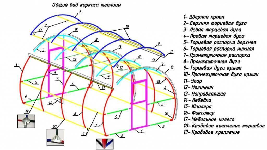Единственное, что бы мы порекомендовали улучшить – это их соединение. Значительно более оправданным будет использование штатной сварки и стандартных комплектующих для таких систем. При этом в дугообразные элементы каркаса будет рациональным ввести либо стальную арматуру соответствующего диаметра, либо ее стеклопластиковый аналог, что еще лучше. Долговечность такой конструкции сомнений не вызывает. Также крепление труб можно осуществить при помощи тех же крабов с различными вариантами их применения.