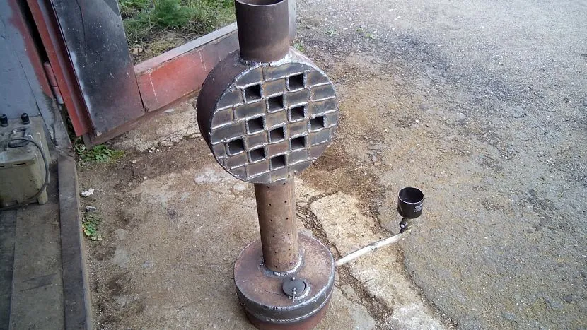 В конце в самом корпусе проделывают два отверстия с противоположных сторон диаметром, равным диаметру дымохода. Если это конструкция из тонких трубок и заглушек, то ее вставляют в корпус и приваривают к стыку заглушек и корпуса, изготовленного из большой трубы.