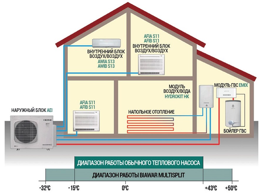 - Зависимость производительности от температуры окружающей среды – бытовые модели обычно ограничены температурой от +45°С до -15°С, можно приобрести оборудование, способное вырабатывать тепловую энергию даже при -25-32°С. Эффективность системы отопления дома с ТН воздух – вода, напрямую зависит от этого параметра.