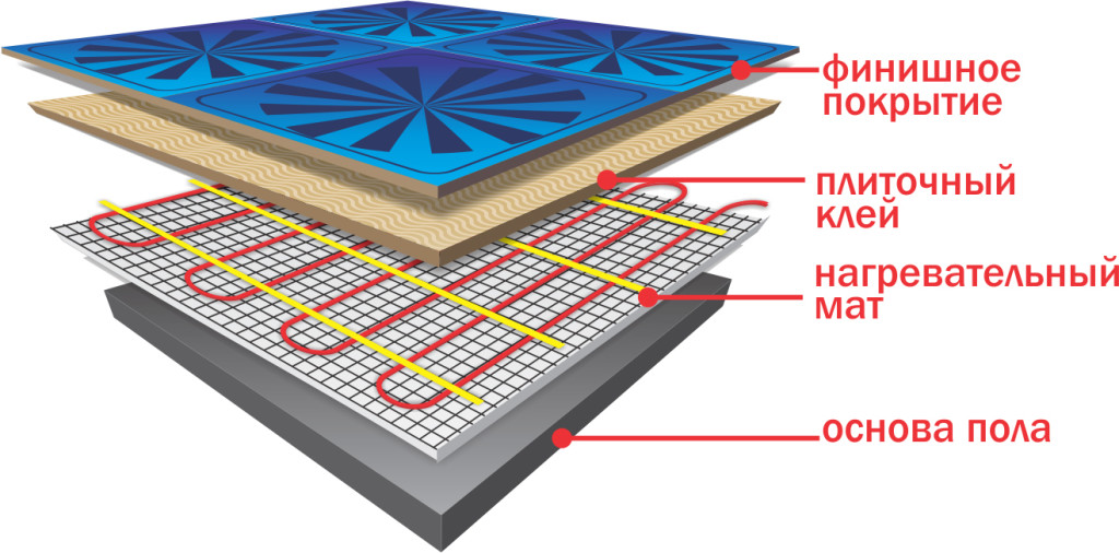 Изделия выполняются на базе ткани с клеевой пропиткой. Состав улучшает сцепление мата с нижней и верхней поверхностью. Клей предупреждает появление воздушных пузырей и расколов в стяжке. Нагревательный провод вплетается в основу из текстиля и получается однородная конструкция. Тканевая прокладка не деформируется при перевозке или длительном хранении, и мат плотно прилегает к поверхности без появления выступов.