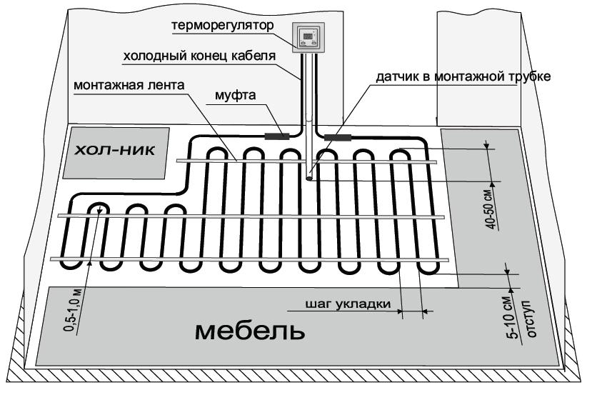 - Следующий шаг наиболее важен – это составление схемы укладки нагревательной электрической системы для подогрева пола. Заметим, что расстояние между системой и другими нагревательными приборами, стенами или коммуникационными узами должно быть не менее чем 30-50 см.