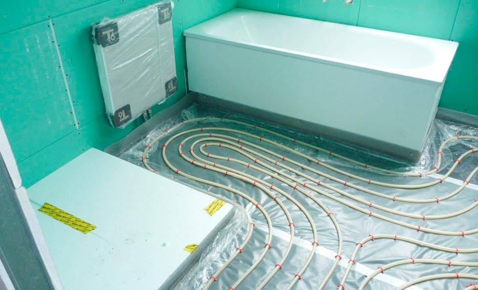 Нагреваясь от проложенных в ней металлопластиковых труб, бетонная стяжка равномерно распределяет тепло, передавая ее керамической плитке.