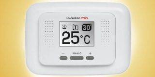 Последняя из трех самых популярных моделей. Она является проводной и многофункциональной. Термостат умеет работать с контурами отопления и горячего водоснабжения, в том числе и с подключаемыми к отопительным системам бойлерами косвенного нагрева. Для удобного контроля температуры в контурах, на борту предусмотрен ЖК-дисплей. Благодаря наличию электронного датчика, термостат обеспечивает поддержание заданного режима с точностью до 0,1 градуса. Он умеет работать в ручном, автоматическом и программируемом режимах. Также здесь реализована программа «Отпуск», обеспечивающая экономичный обогрев жилища в отсутствие жильцов.
