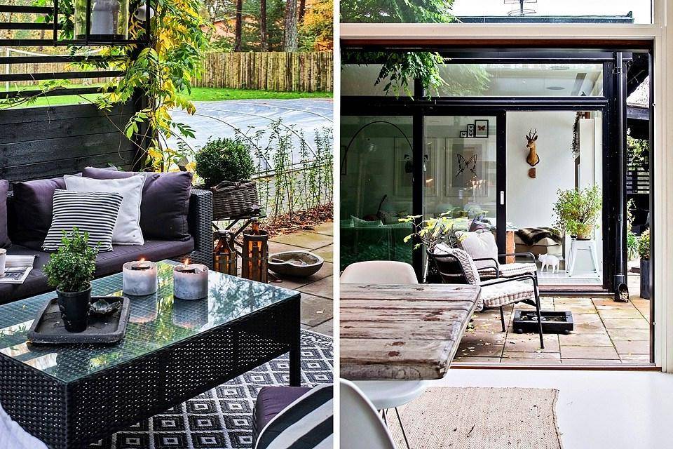 Некоторые террасы обладают настолько маленькой площадью, что речь об обустройстве камина, зоны барбекю или места для отдыха с роскошными диванами просто не идет. Но на любой, даже самой крохотной террасе (больше похожей на широкое крыльцо с козырьком) найдется место для пары небольших садовых кресел или хотя бы стульев со спинками. Террасу любого размера можно украсить с помощью цветочных кашпо или небольшой напольной вазы. Красивый уличный светильник не только обеспечит необходимый уровень освещения в темное время суток, но и станет декоративным элементом. Акцентными предметами могут стать как садовые стулья, так и яркий коврик перед входной дверью.