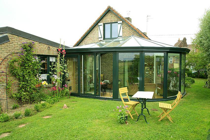 Стеклянная крыша веранды зрительно увеличивает размер помещения, придавая пристройке легкость и воздушность