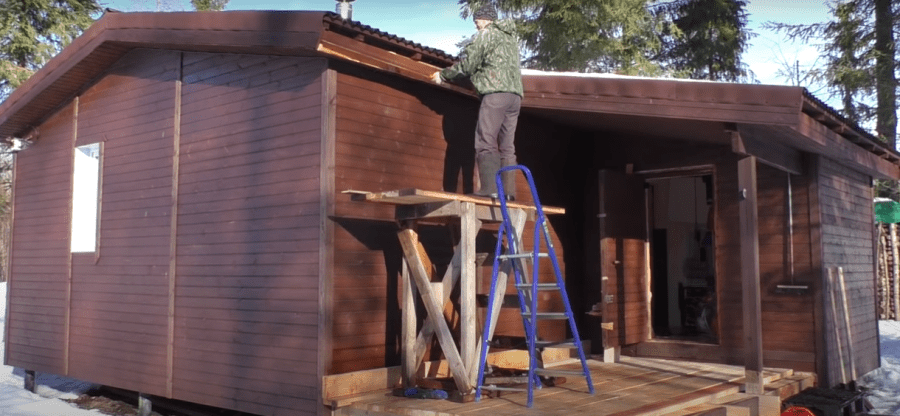Кровля – односкатная, с малым уклоном в зависимости от выбранного материала. Более пологая по сравнению с домом крыша будет выглядеть гармонично, если кровельный материал одинаковый.