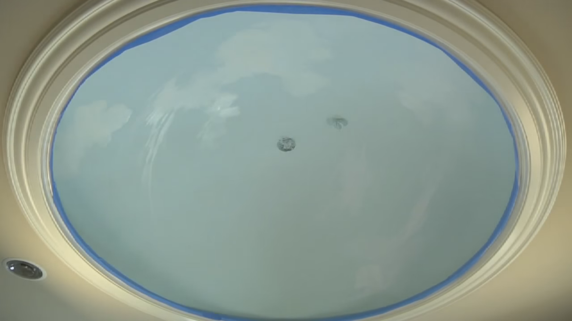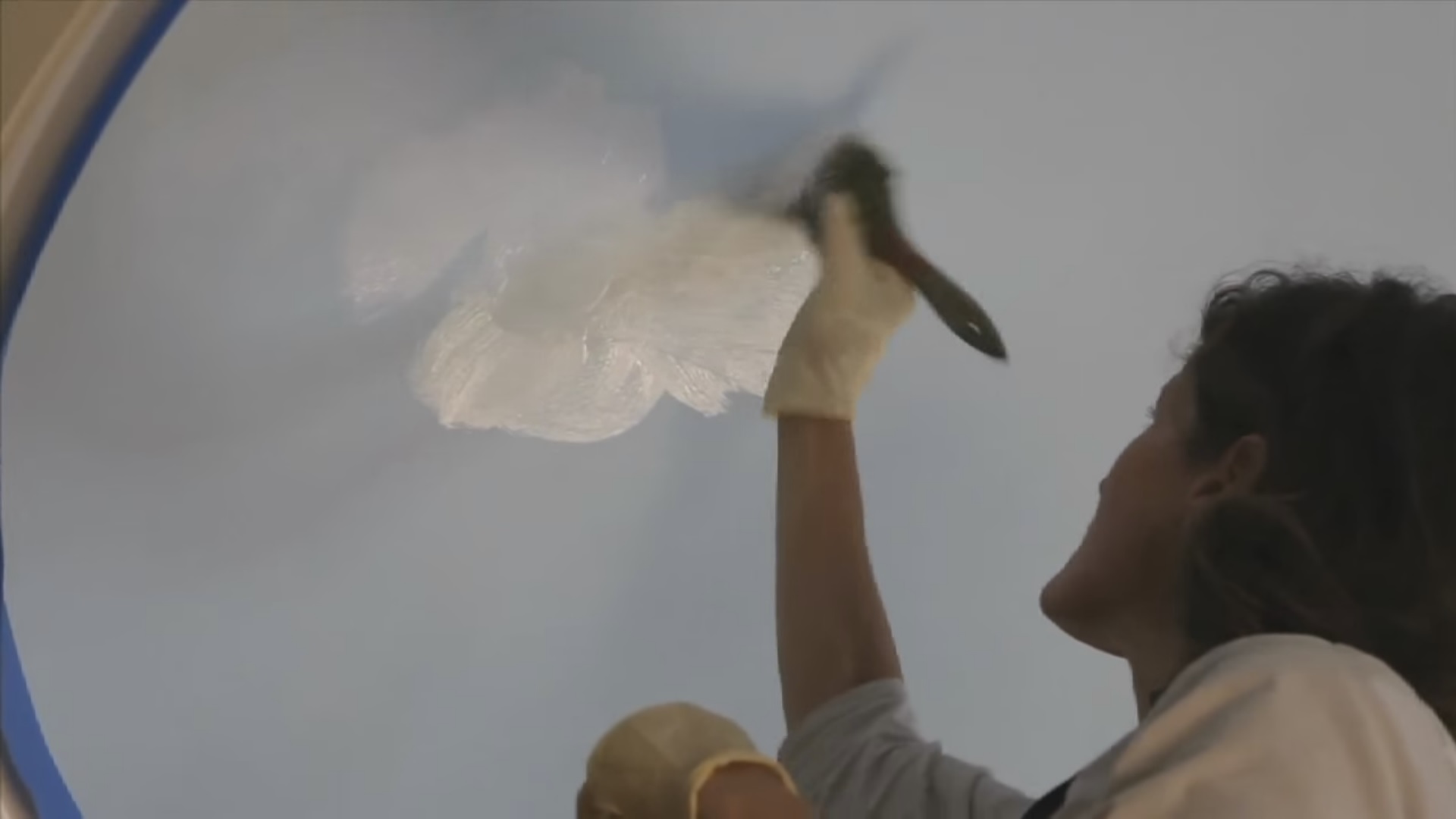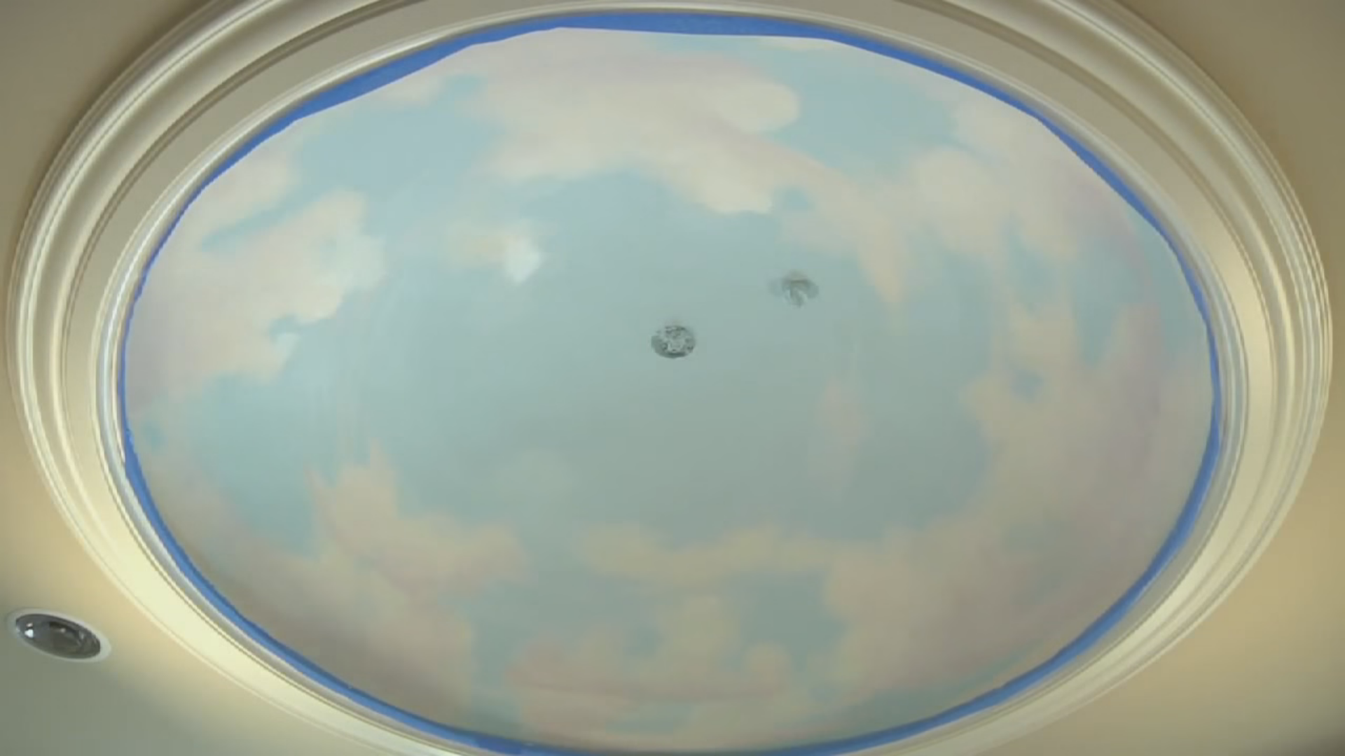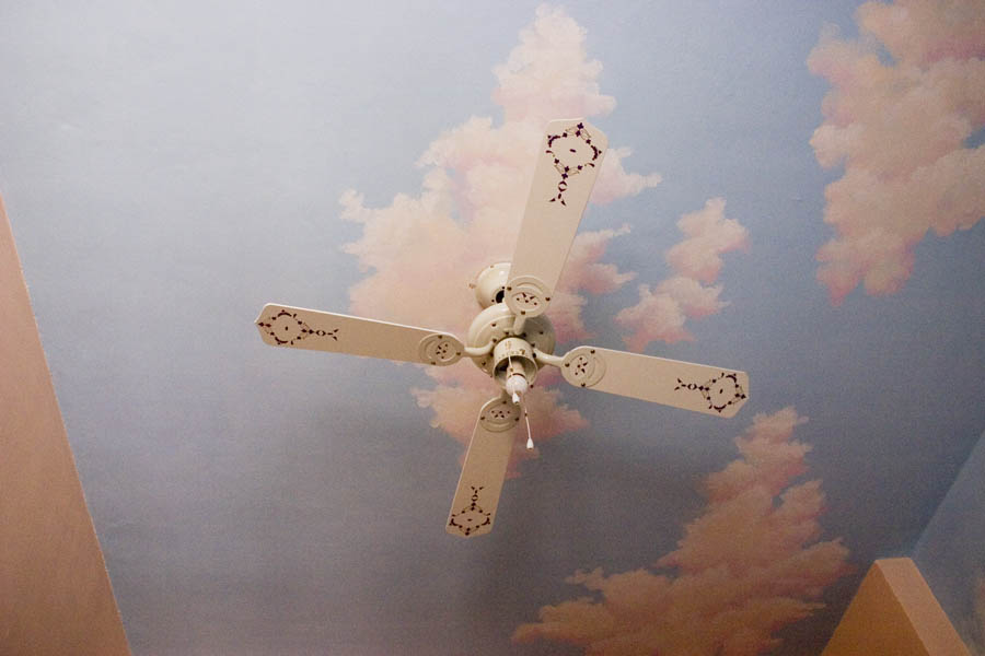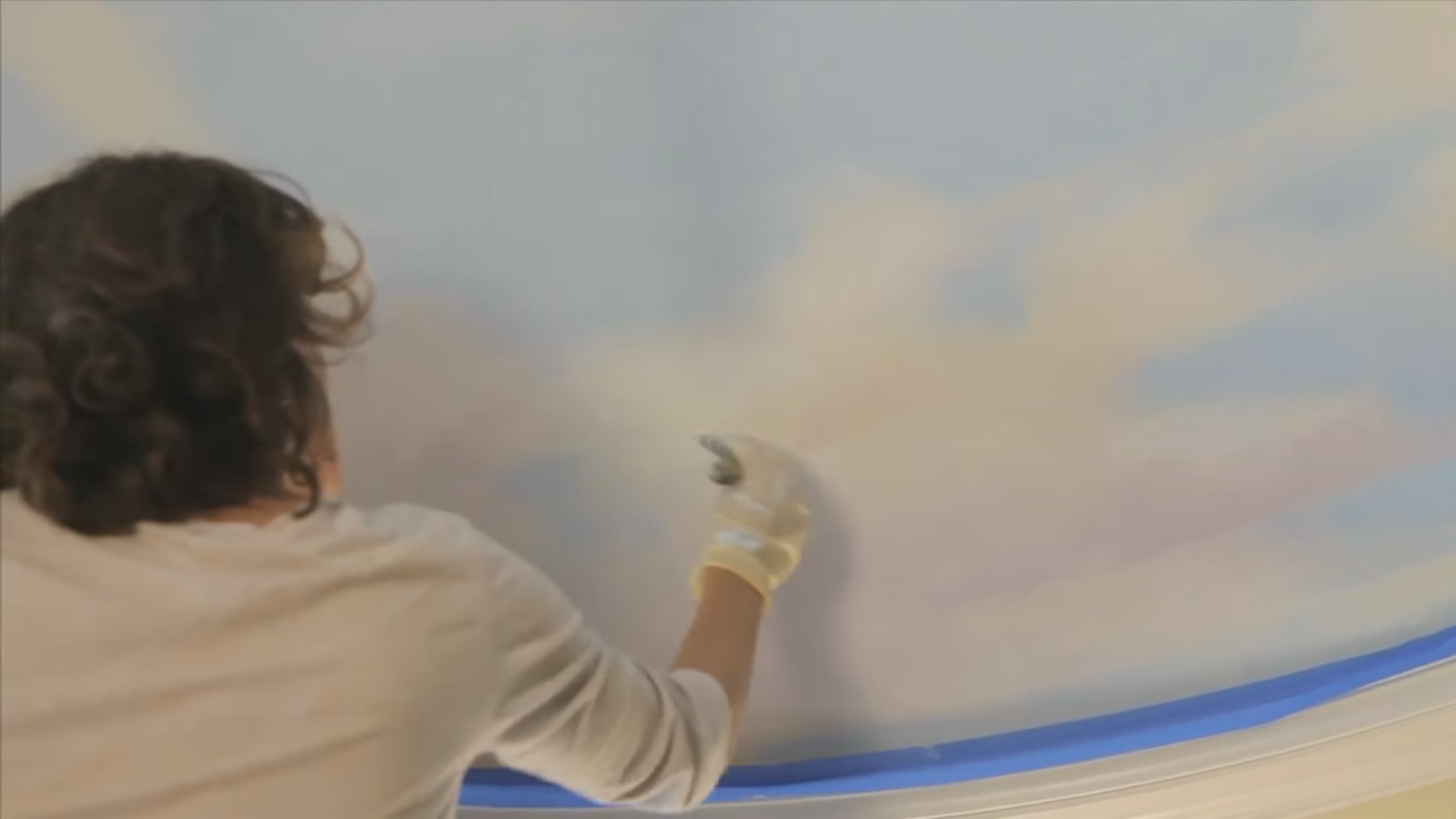 Начинать работы желательно с центра помещения. Если не хватит сил на создание облачного потолка по всей комнате, можно заключить готовую часть в круг посредине помещения, получится эффект круглого окошка с видом на небо. Второй вариант – белые тучи собрались только в том месте, где вы начали их прорисовывать, а все остальное пространство – это чистое небо. В любом случае, стоит попробовать воплотить в жизнь эту невероятную идею.