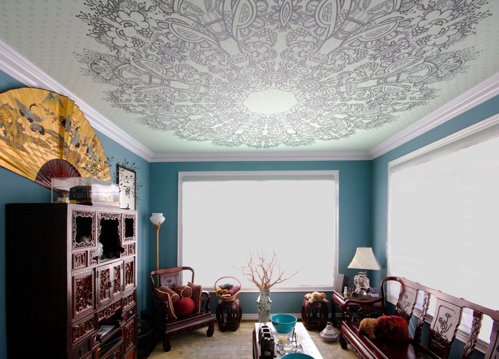 Фото неординарного орнамента на потолке белого цвета в качестве украшения интерьера