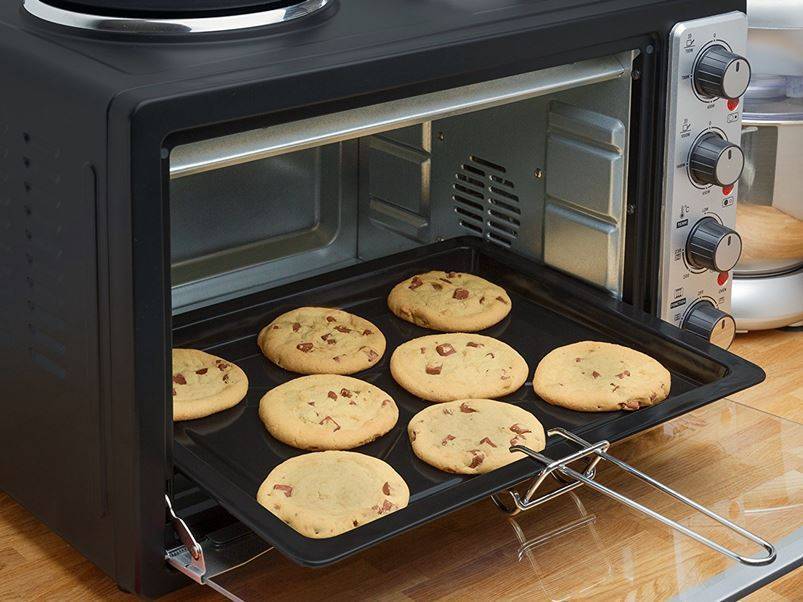 | Лучшие настольные электродуховки с конфорками | 1 | 9.7 / 10 | Металлический корпус, двойное стекло, регулировка конфорок | ||