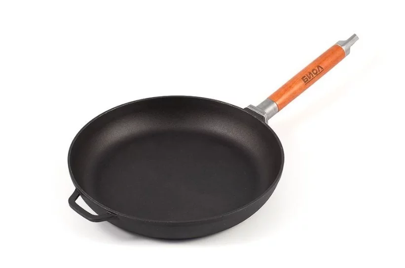 Чугун — уникальный материал с большой теплоемкостью и относительно невысокой теплопроводностью. Для кого-то, судя по отзывам, это недостаток, но многие хозяйки считают это положительным качеством, поскольку блюда томятся, как в русской печи. Сковорода оснащена съемной ручкой, что позволяет использовать ее в духовке. Материал не деформируется и не боится перегрева.