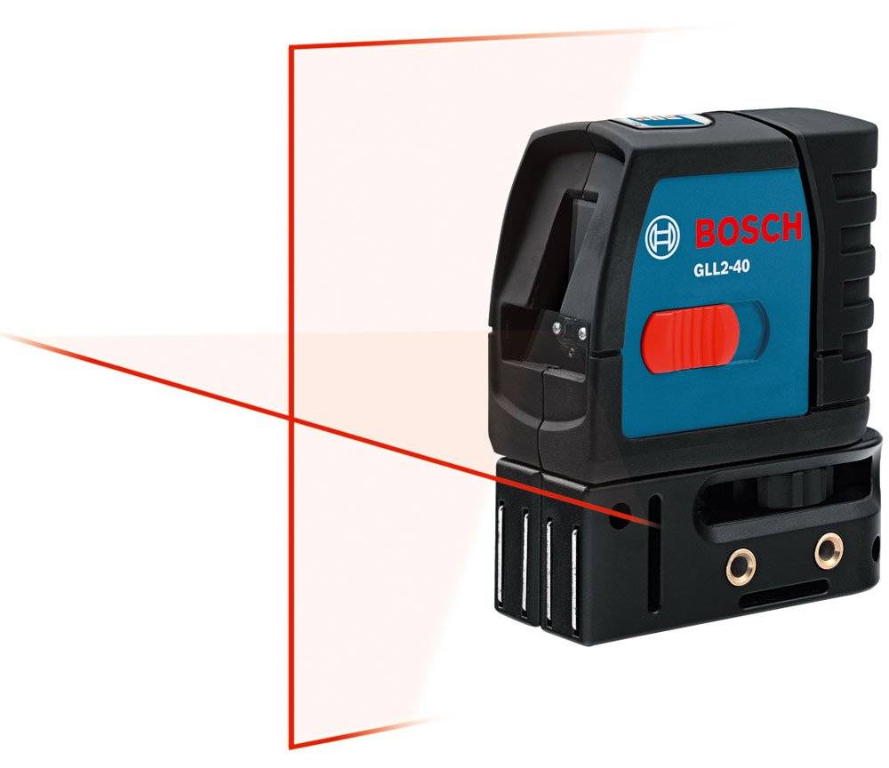 Лазерный нивелир Bosch GCL 2-15 Professional одновременно проецирует вертикальную и горизонтальную линии перед собой и две точки: одну снизу, вторую сверху — точки отвеса и зенита.